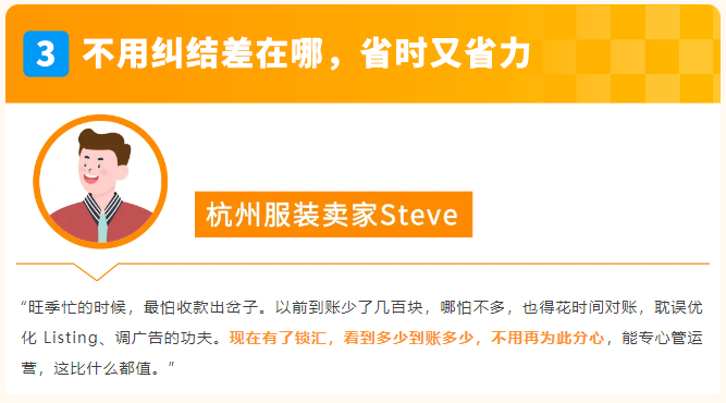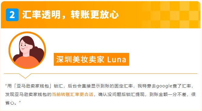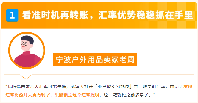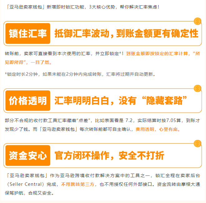 下面,小编将结合卖家们在汇率波动中遇到的真实困扰,先带大家看看那些因汇率波动而踩过的坑,再详细拆解「即时锁汇」功能如何帮卖家守住钱袋子。 这些案例不是个例。跨境卖家最痛的领悟是:选品再好、运营再强,汇率波动这一环没控制好,利润就像“指间沙”,看着到了手里,实际却悄悄漏掉了一部分。 用了「亚马逊卖家钱包」锁汇功能的卖家们,感受都很一致:“收款终于不因为汇率焦虑了”。 「亚马逊卖家钱包」来自于「亚马逊跨境收付款解决方案」。除了即时锁汇外,「亚马逊卖家钱包」还有自主掌控、安全灵活等一系列优势,帮您灵活高效管理收付款。 使用「亚马逊卖家钱包」,您可根据需求或汇率情况,自主掌控提现时间和提现金额,最快1个工作日到账。 通过「亚马逊卖家钱包」,直接用美元向您美国当地和中国香港*的供应商付款,无需换汇,支付美国当地供应商,限时0手续费。 *单笔付款金额需要大于等于2500美元 「亚马逊卖家钱包」支持在卖家后台完成全部的收付款操作及资金管理,不用跳转任何外部平台,不用担心资金流转、账户数据被第三方获取;而且支持以图表直观查看进出账情况,可随时获取、导出并下载「亚马逊卖家钱包」账户对账单。 若您希望安心收款,「亚马逊跨境收付款解决」方案里还包括操作便捷、自动转账的「亚马逊全球收款」,帮您解决跨境收款难题! 使用「亚马逊全球收款」,回款直接以人民币存入中国内地银行账户,或者以港币/美元存到中国香港账户(此功能需要年净销售额≥10万美金),持牌服务商监管合规,稳稳落袋更安心。 款项将于结款日自动打出,最快1个工作日到账,补货、充广告预算都不耽误。 阶梯费率+联合账户,生意越大,费率越低,且费率公开透明,无隐藏收费,您可在后台清晰查看收款费率、汇率明细。 覆盖亚马逊全球10大站点*,卖家可在后台进行多站点收款的一站式管理,对账效率直线提升。 *「亚马逊全球收款」现已覆盖10大亚马逊全球站点(美国、加拿大、墨西哥、英国、德国、法国、意大利、西班牙、荷兰、日本)
