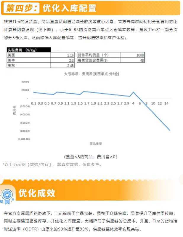 您是否也被上述问题而困扰?本期官方专属顾问将借助两位真实卖家的实战案例,带您一步步了解如何根本性降低供应链成本、以及精准分析被退货的关键原因,助您实现更高效的库存管理与物流优化,显著提升客户复购与品牌口碑! Tim是一位主营大型电器类目的工厂型卖家,坐拥多条自动化生产流水线。在亚马逊运营三年来,工厂持续扩充产品线,并高度重视品牌建设和长期策略规划,全力追求可持续增长。 分仓费用对比计算器是亚马逊卖家成长服务的专属工具。它能够帮助三方卖家比较和评估不同入库配置选项的费用差,为不同重量商品选择更划算的方式。 接下来,官方专属顾问手把手教您如何使用分仓费用对比计算器。 <请在蓝色区域输入$或RMB 2选1,会自动按照汇率换算> *以上为示例【数据/内容】,非真实数据,仅供参考。 <请在蓝色区域输入$或RMB 2选1,会自动按照汇率换算> *以上为示例【数据/内容】,非真实数据,仅供参考。 *以上为示例【数据/内容】,非真实数据,仅供参考。 计算器生成费用分布图后,卖家可清晰了解到不同商品重量,以及从美西单点到美东5仓的综合费用差。 (1)若费用差>0:选择分仓更划算 (2)若费用差在0附近:可以考虑混装 Lucy是一位主营美妆产品的卖家。店铺创立以来,Lucy一直致力于探索最前沿的智能美护技术,后来推出高端美妆产品,平均售价达1000美元。 如果您也想在官方专属顾问的帮助下 高效优化供应链配置方案 快速查清商品退货原因 可前往亚马逊全球开店官方 了解更多关于亚马逊卖家成长服务!