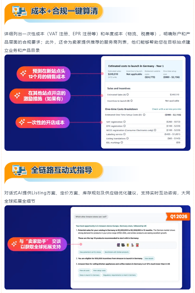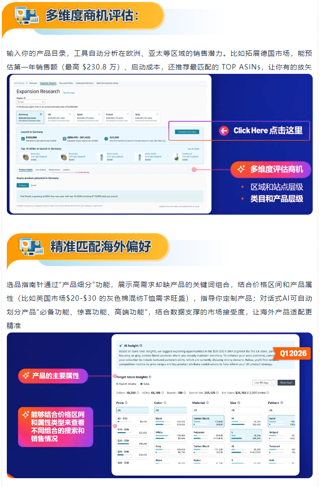 升级版“全球销售”页面+选品指南针,叠加2026年即将上线的对话式AI功能,从商机评估到合规配送,全程AI护航,解决全球拓展的所有难题: