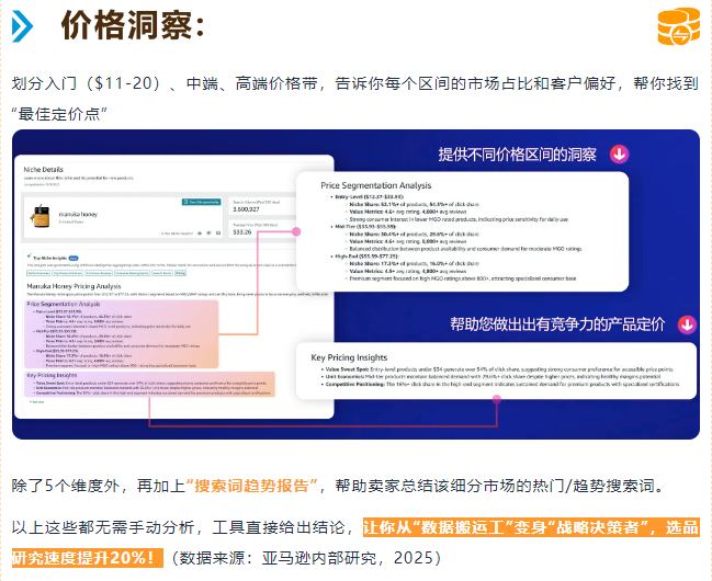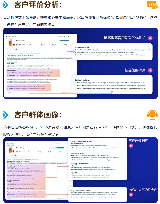 通过分析数十亿次客户搜索、浏览、加购等行为数据,锁定 “高搜索、低成交” 的核心信号 —— 这意味着消费者有强烈购买意愿,但现有产品无法满足,正是新品切入的黄金窗口