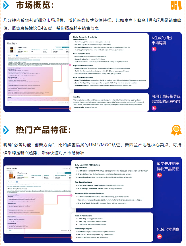 升级后的商机探测器,自带细分市场AI智能洞察提取功能,完美适配选品研究阶段的核心需求,自动生成6大维度的类目分析报告,把复杂数据变成可执行的选品方案: