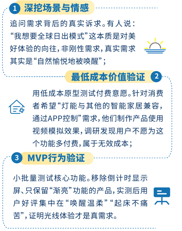 Robin 分享了唤醒灯的开发案例:最初收到“模拟全球日出”、“连接智能家居”、“精准倒计时”等酷炫需求,但通过三步曲验证,果断判定为伪需求: