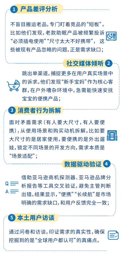 以母婴客群为例,五步法让他们精准锁定核心需求:户外出行场景下,宝宝需要“长续航+便携”的助眠产品。于是,适配婴儿车、可无线使用、小巧轻便的新品应运而生,一上市就成为宝妈们的“遛娃神器”。